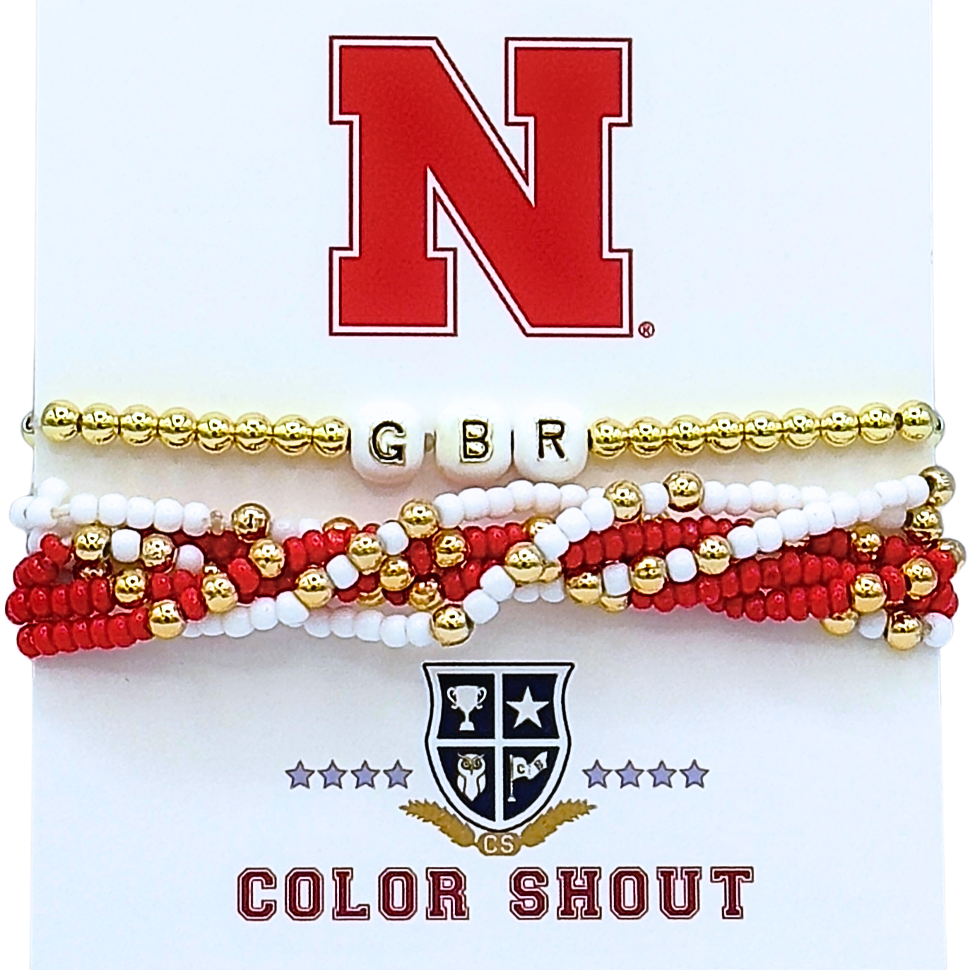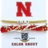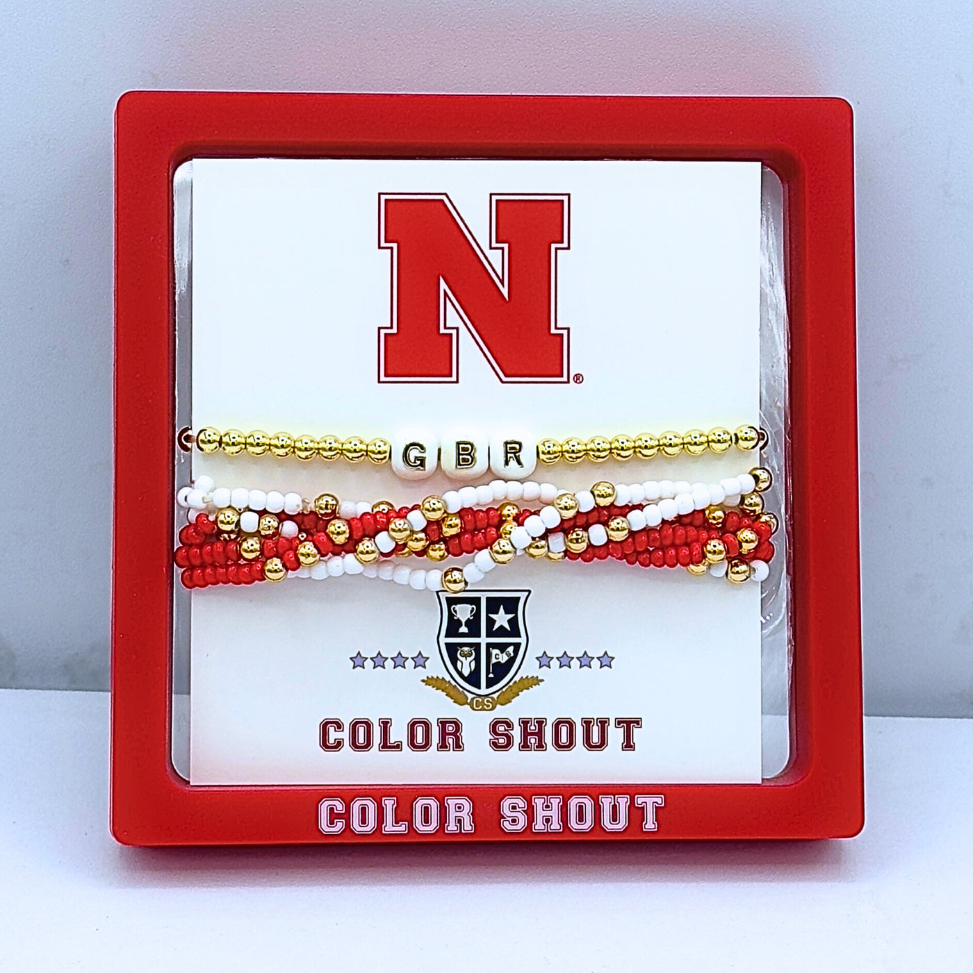 Show off your school spirit in this Set of 6 - Colorful Glass Czech Beads and gold ball beads scattered throughout these fun stretchy bracelets. Together with a gold beaded bracelet with GBR enamel tiles!