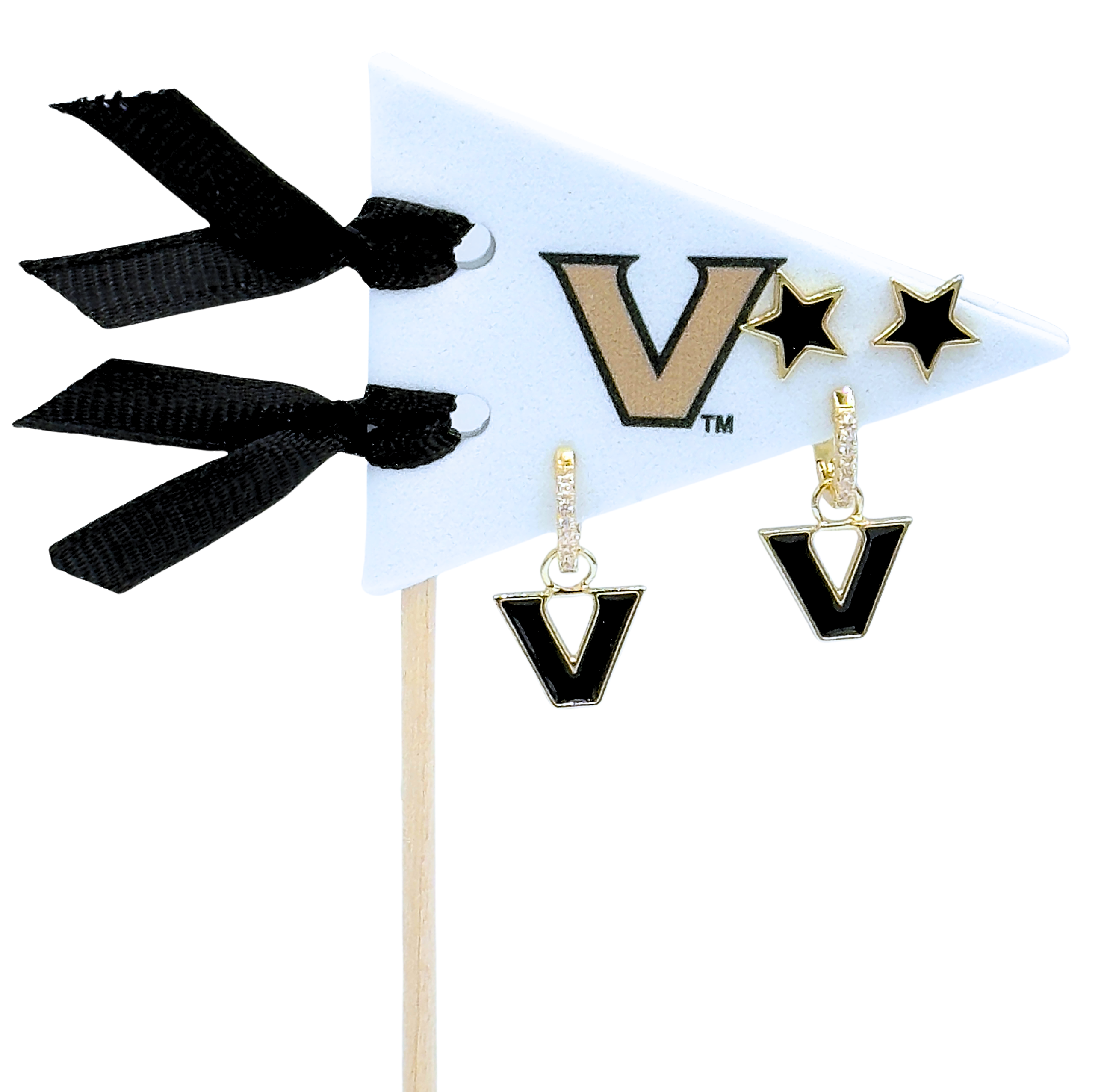 Wave your Vandy colors high and proud with this two-piece earring set! Show off your pride with one huggie logo hoop earring plated in 18k yellow gold, plus one star stud plated in 18k yellow gold and black Enamel. Zircon stone adds a sparkling finishing touch to this eye-catching set!